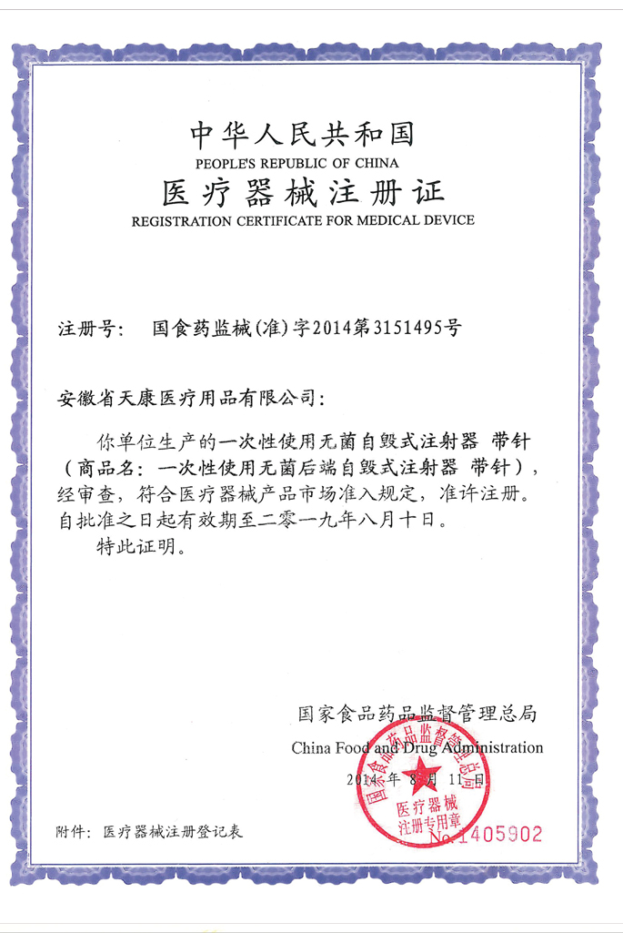 后端自毁注射器注册证